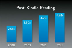 Jeff Bezos termine en lançant un message à peine voilé aux éditeurs. Après l’achat d’un Kindle, les possesseurs du reader lisent de plus en plus et achètent donc potentiellement plus d’ebooks. En 2011, ils ont lu 4,62 fois plus après avoir acquis un Kindle.