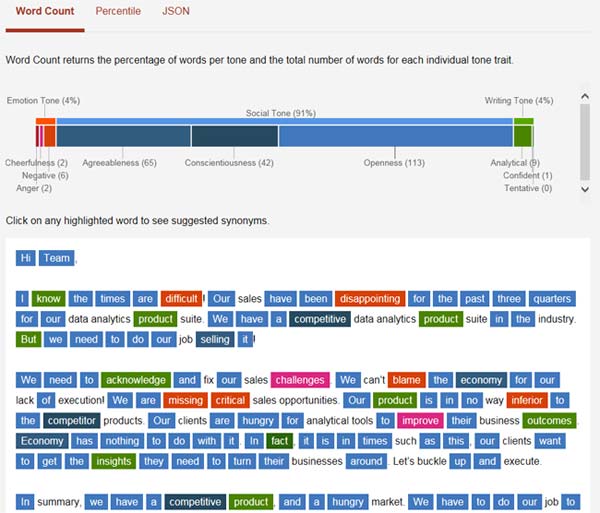 « Tone Analyser » permet d’analyser son style d’écriture. Il suffit de soumettre un texte et Watson l’analyse. Il va étudier le texte et les émotions qui s’en dégagent. Il va détecter si l’écriture est hésitante ou confiante, le ton utilisé, le caractère social, si les termes employés sont agressifs ou négatifs, etc.
