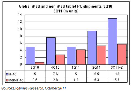 En plus de la crise, la progression des ventes des tablettes concurrentes de l’iPad sont ralenties par d’autres facteurs. Digitimes Research précise que la plupart des fabricants de tablettes, hormis Apple, souffre d’un excédant de stock au 3e trimestre. Beaucoup de tablettes on également été repoussées. En conséquence, les ventes de tablettes autres qu’iPad n’ont progressé que de 10,1% par rapport à la même période l’an dernier.