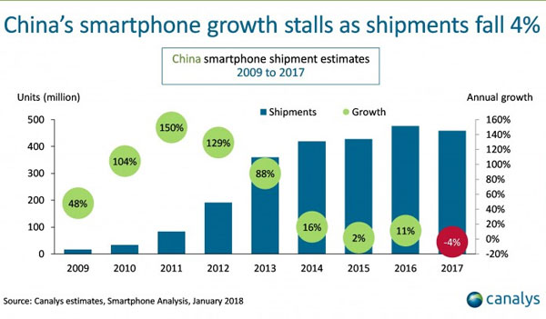 Le marché chinois des smartphones est arrivé à saturation. D’après les derniers relevés de Canalys 2017 n’aura pas été une bonne année.
