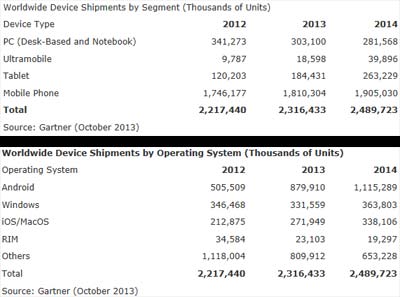 Sur le terrain des OS, Android continue de régner avec une part de marché de 38% avec près de 880 millions d’appareils en 2013. iOS affiche aussi une belle progression avec 331 millions d’appareils.