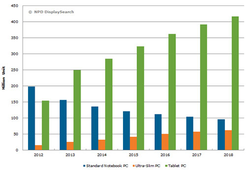 Le secteur a également vu la demande pour les tablettes 7 pouces faiblir fortement dans les pays en développement et en Chine. Le format est cannibalisé par les phablet de 5,5 pouces et plus. Le format 7 pouces devrait être de moins en moins attractif jusqu’en 2018.