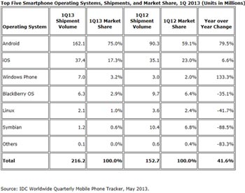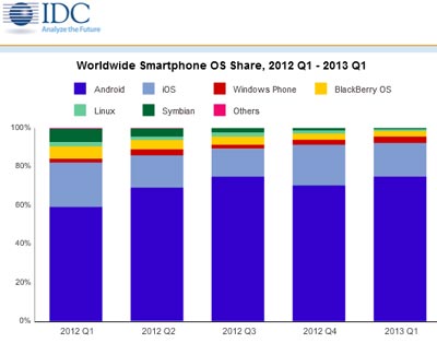 La progression d’Apple est plus modeste avec + 6,6%. La domination d’Android et iOS est totale avec 199,5 millions de smartphones vendus sur 216,2 d’unités au premier trimestre 2013.