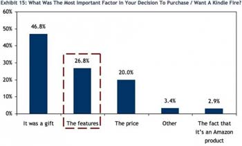 Premier élément de surprise le prix n’a pas été le principal élément déclencheur pour l’achat du Kindle Fire. 46,8% l’ont reçu en cadeau et 26,8% ont été attiré par les services proposés. Ce dernier point montre une fois encore que la richesse de l’écosystème est très importante pour le succès d’une tablette.