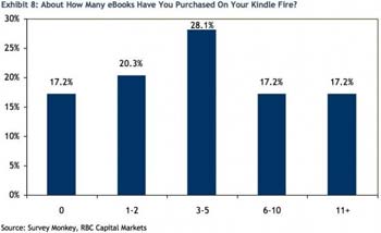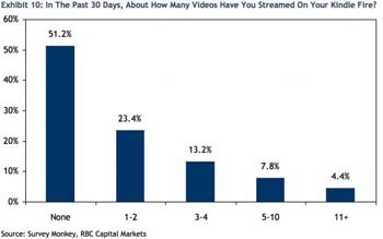 Autre point intéressant, la lecture vidéo n’est pas l’activité principale sur Kindle Fire. Les services de streaming vidéo n’ont pas encore convaincu les possesseurs de Kindle. En revanche, la lecture arrive en tête. 70,7% lisent des livres numériques et 28,1% ont acheté entre 3 et 5 ebooks.