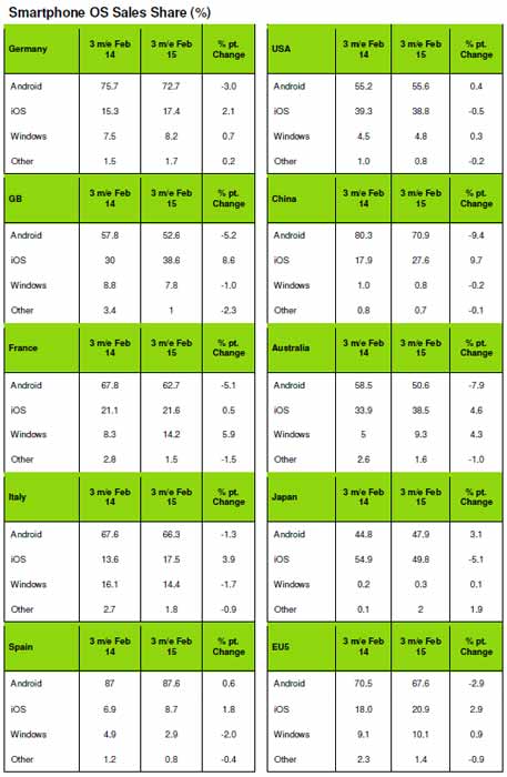 Bonne surprise pour Windows Phone, sa part de marché progresse légèrement en Europe de 0,9%. Elle augmente cependant fortement en France avec une hausse de 5,9% par rapport à février 2014. La part de marché de Windows sur smartphone en France est maintenant de 14,2%.