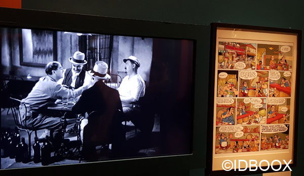 Des planches de plusieurs albums sont encadrées à côté d’extraits de films. Pour la scène de la taverne dans Astérix Le Bouclier Averne, par exemple, Gosciny s’est inspiré de la fameuse séquence de la partie de cartes de Marius de Marcel Pagnol.