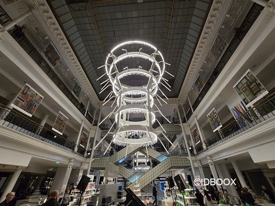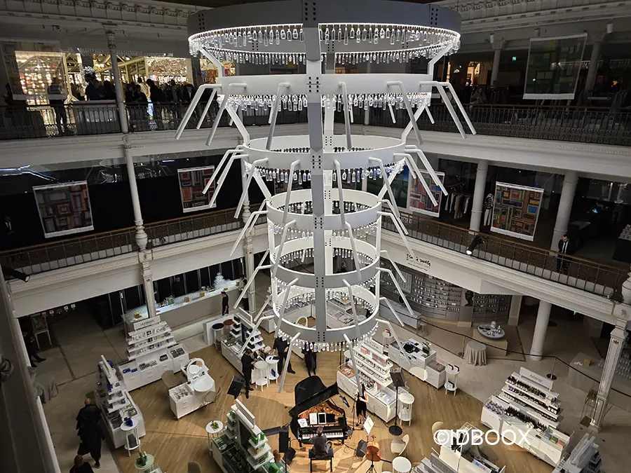Au centre du magasin, l’émerveillement prend de la hauteur. Autour de l’escalator, Song Dong déploie deux lustres monumentaux composés d’anneaux d’acier et de bouteilles éclairées (plus de 7 mètres).