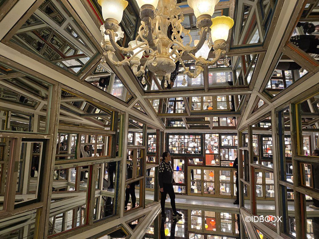 Au centre du magasin, l’émerveillement prend de la hauteur. Autour de l’escalator, Song Dong déploie deux lustres monumentaux composés d’anneaux d’acier et de bouteilles éclairées (plus de 7 mètres).