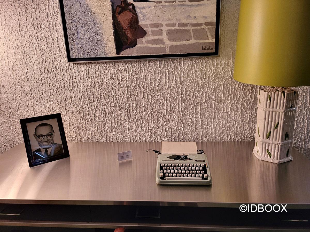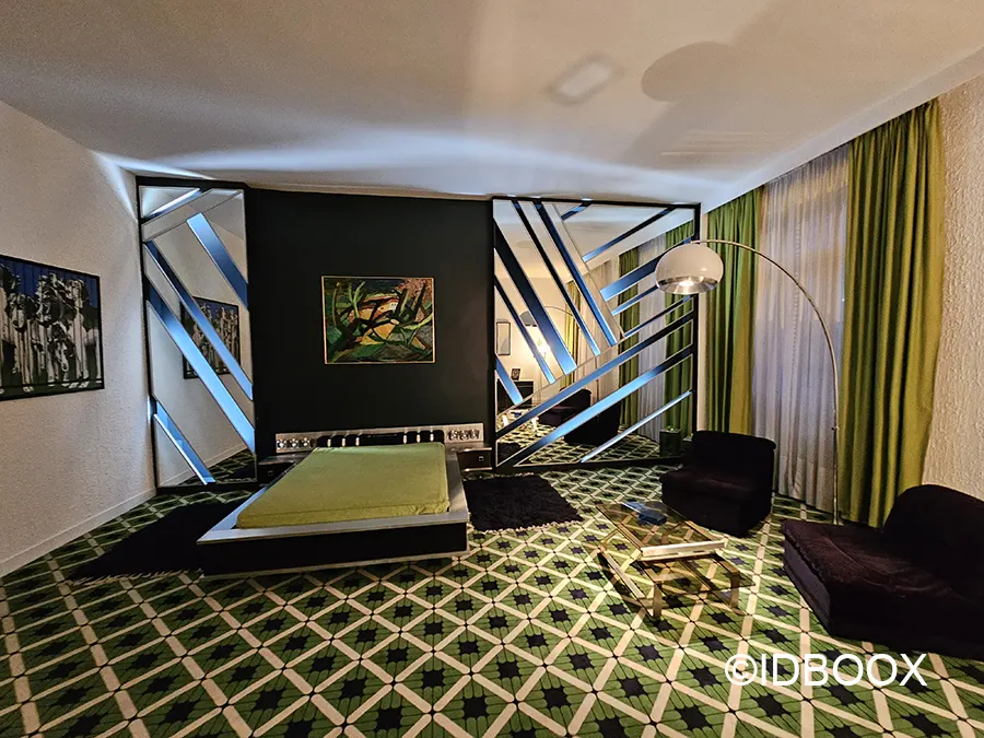 Ensuite, vous visiterez la “chambre 70”, où les auteurs venaient en résidence. Le design tranche totalement avec le reste de l’édifice, avec un côté pop et coloré très vintage : tissus vert pomme, moquette à damier vert et bleu, mobilier sombre, encadrement métallique du lit et grands miroirs géométriques ! On finit la visite par la salle de bains à fleurs !