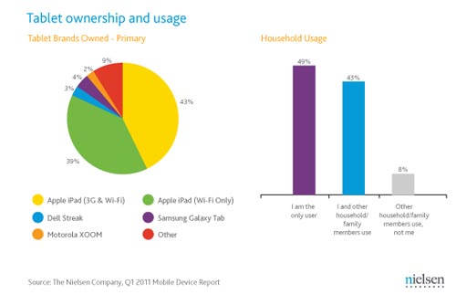 Sur la répartition des tablettes aux Etats-Unis. Pas de surprise, l’iPad domine avec une part de marché de 82% des possesseurs de tablettes outre-Atlantique et 43% possèdent un iPad en 3G. On note au passage la part supposée de tablettes sous Android, est seulement 18% avec 4% pour la Samsung galaxy Tab et 2% pour la Xoom.