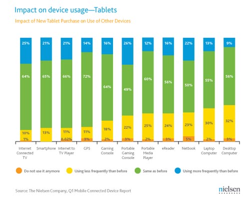 L’informatique évolue rapidement et les tablettes sont en train de bousculer les habitudes des américains. Nielsen a publié une étude sur les tablettes et leurs usages, leurs impacts sur les appareils numériques et informatiques aux Etats-Unis. Les tablettes entrent dans les foyers et prennent une place à côté des autres devices connectés, allant parfois jusqu’à les remplacer.