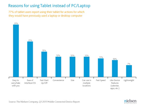 Sur la montée en puissance des tablettes dans le cœur des américains, l’étude donne plusieurs raisons pleines de bon sens. Une tablette est facile à emporter avec soi (31%). Le système d’exploitation est simple à utiliser (21%). Elle démarre rapidement (15%). La taille réduite d’une tablette (12%). Bref, elles comblent tous les manques des ordinateurs portables ou de bureau.