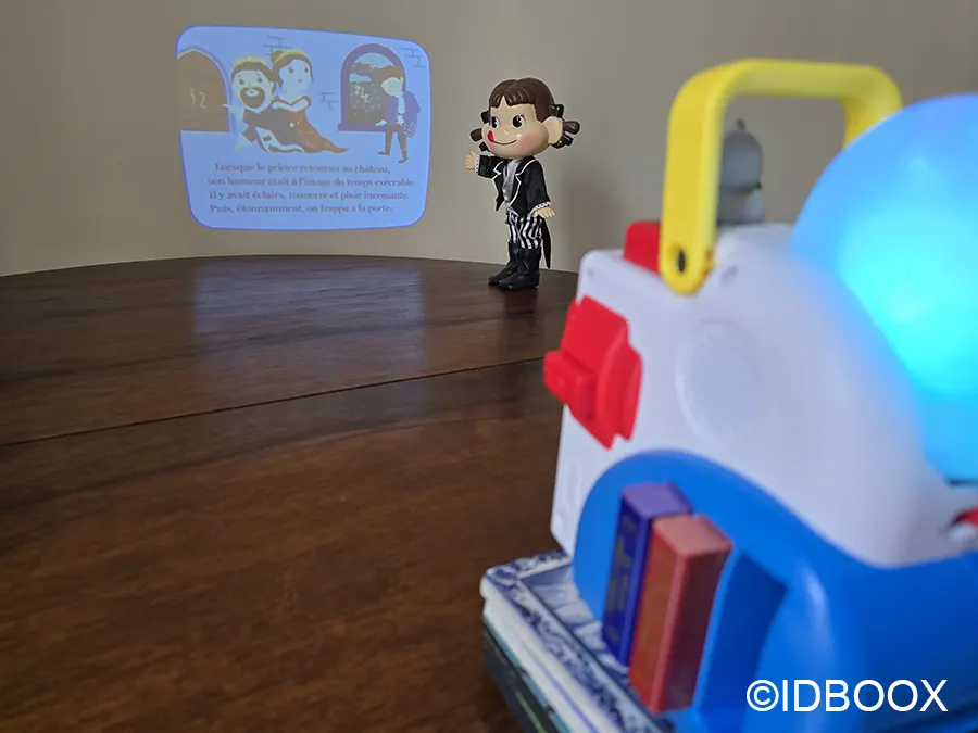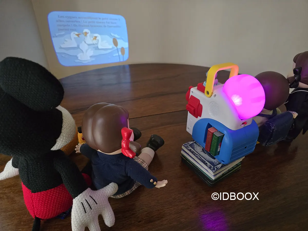Le projecteur est livré prêt à l’emploi. Le coffret est complet : il inclut l’appareil, bien sûr, ainsi que trois cartouches d’histoires et un petit personnage interactif.