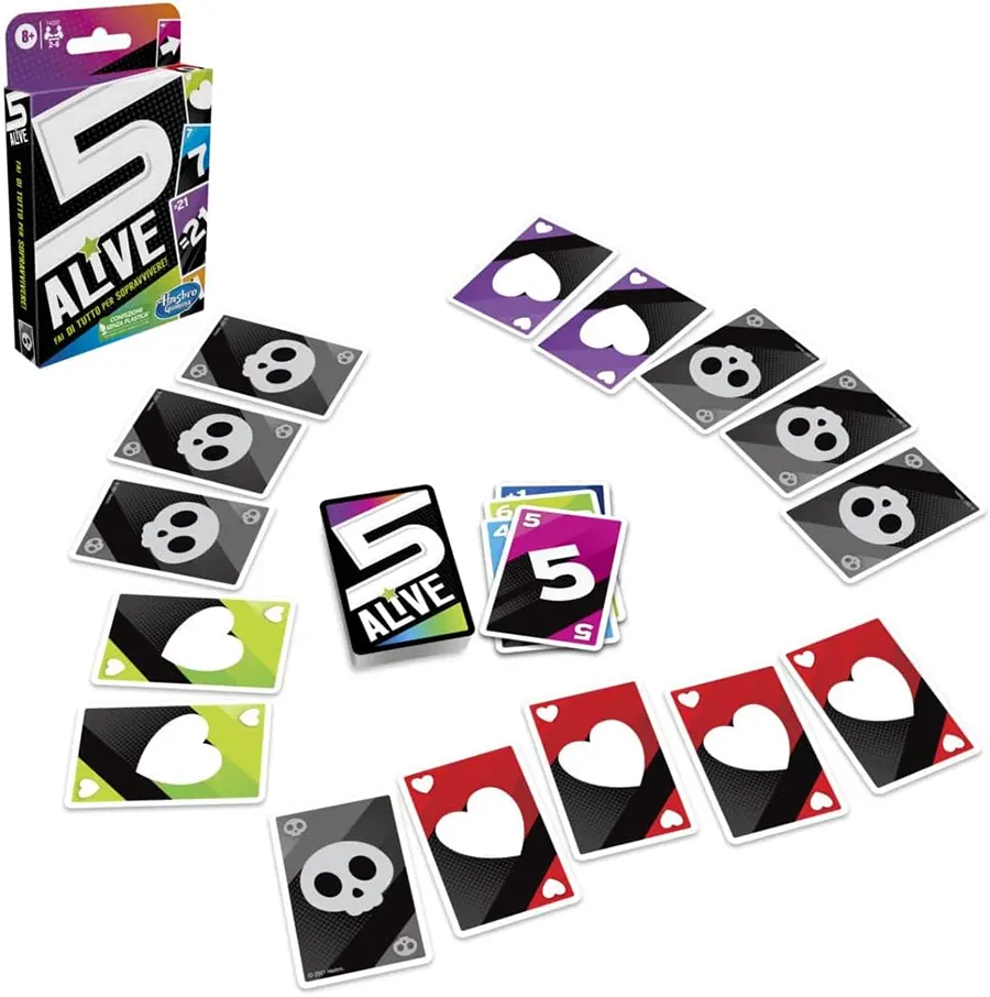 5 Alive est un jeu de cartes simple, rapide et plein de rebondissements. On peut le glisser dans sa poche. La règle est simple : ne pas dépasser 21 pour garder ses 5 vies. Si un joueur dépasse 21, il doit retourner une carte vie.