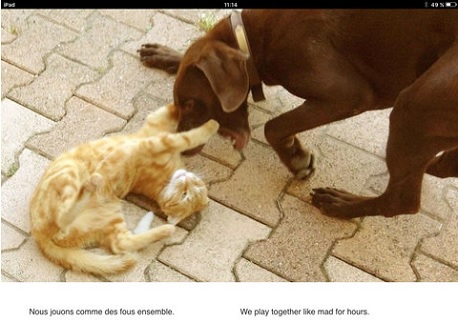 Chaque animal a un son qui lui est propre, en le touchant sur l’écran de la tablette on entend un petit air de saxo qui le caractérise. Les textes sont courts et bien conçus, ils sont en français et en anglais et peuvent être lus ou écoutés.