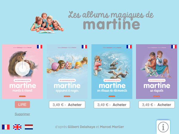 Martine Monte à cheval est proposé gratuitement et les autres titres de la série Martine sont à 3.49 euros (prix unitaire), ce qui n’est vraiment pas cher pour des ebooks aussi bien conçus.