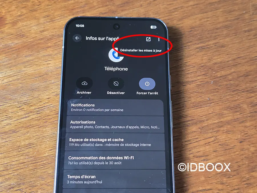 - Appuyez sur “Désinstaller les mises à jour”. Avec cette action, vous allez revenir à la version d’origine de l’appli téléphone avec les gestes initiaux.