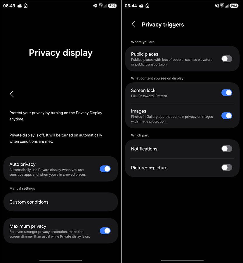 Le dénommé Ash sur X a déniché dans le code de One UI 8.5 des informations sur les paramètres d’une fonctionnalité baptisée, Privacy Display. Ce système fonctionne comme les filtres qu’on rajoute sur un écran pour limiter l’angle de vision.