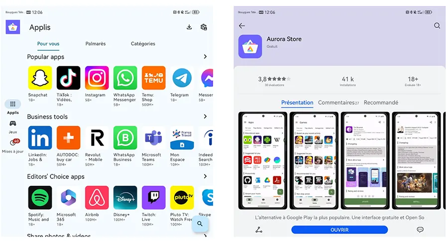 Maintenant, une alternative au Google Play Store appelée Aurora Store est disponible sur les smartphones HUAWEI. Vous pouvez la télécharger depuis le HUAWEI AppGallery.