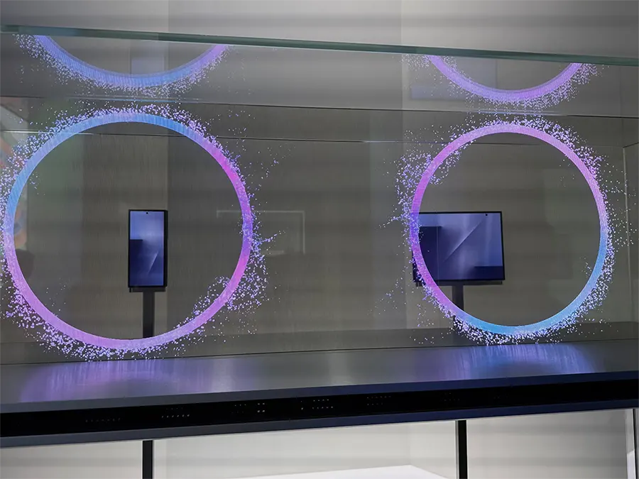 Le Galaxy Z TriFold était exposé à l’abri derrière des vitres en verre. Le smartphone était visible en mode fermé et ouvert. Une vidéo projetée sur une vitre transparente détaillait la façon dont il se replie.