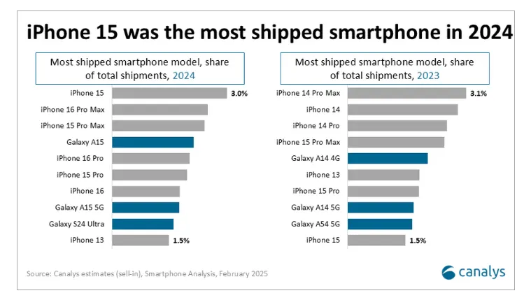 Sans conteste, le grand gagnant de 2024 est Apple avec un chapelet d’iPhone. Le smartphone le plus vendu dans le monde en 2024 n’est pas l’iPhone 16. Il s’agit de l’iPhone 15. Cet ancien modèle représente 3% des 1,22 milliard d’appareils vendus par tous les constructeurs, soit 36,6 millions d’unités.