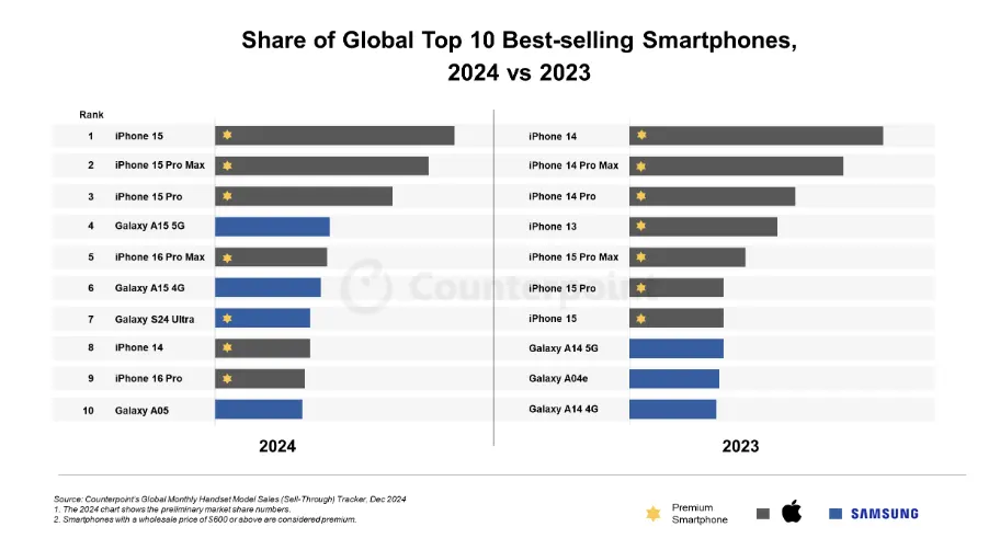 Samsung a réussi à placer un smartphone haut de gamme dans ce classement contrairement à 2023. Il faut noter que le Galaxy S24 Ultra est le premier Galaxy S à entrer dans le top des smartphones les plus vendus depuis 2018.