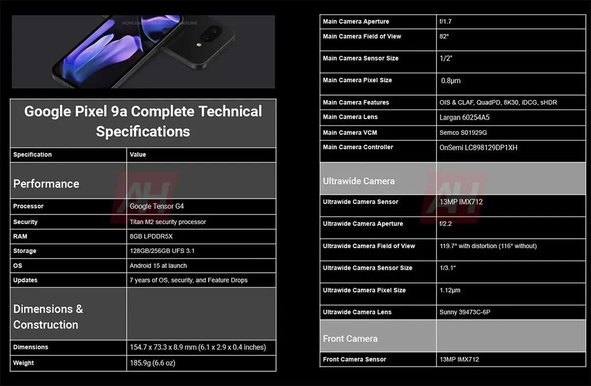 Cette nouvelle fuite est différente. Les informations proviennent d’un opérateur. Il dévoile la fiche technique complète du Pixel 9a.