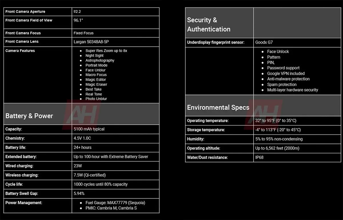 On passe à l’appareil photo. N’espérez pas plus de deux caméras à l’arrière. On trouverait un capteur principal de 48MP Samsung ISOCELL GN8 avec une ouverture f/1.7 et un ultra grand-angle de 13MP (f/2.2) Sony IMX712. Google reprendrait le même capteur Sony IMX712 pour l’appareil Selfie. L’angle de vision est de 96,1°.