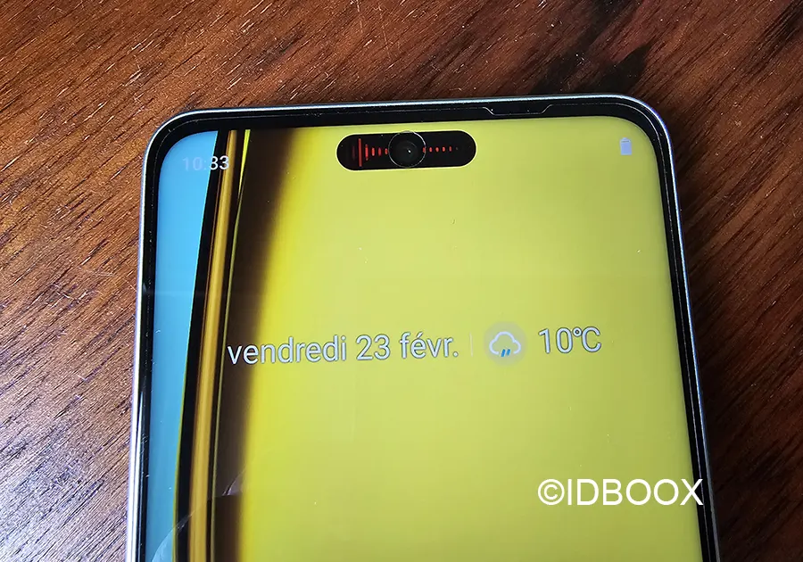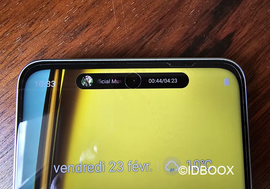 Le C67 tourne sous Android 14, sa caméra selfie sert de Dynamic Island. Du côté de chez Realme, elle s’appelle Mini Capsule. Cette version 2.0 étend ses fonctions par rapport à celle du C55 qui nous avait laissé sur notre faim. La Mini Capsule 2.0 affiche autour de la caméra l’état de la batterie, la musique, la météo, les données consommées ou encore les statistiques sur les pas.