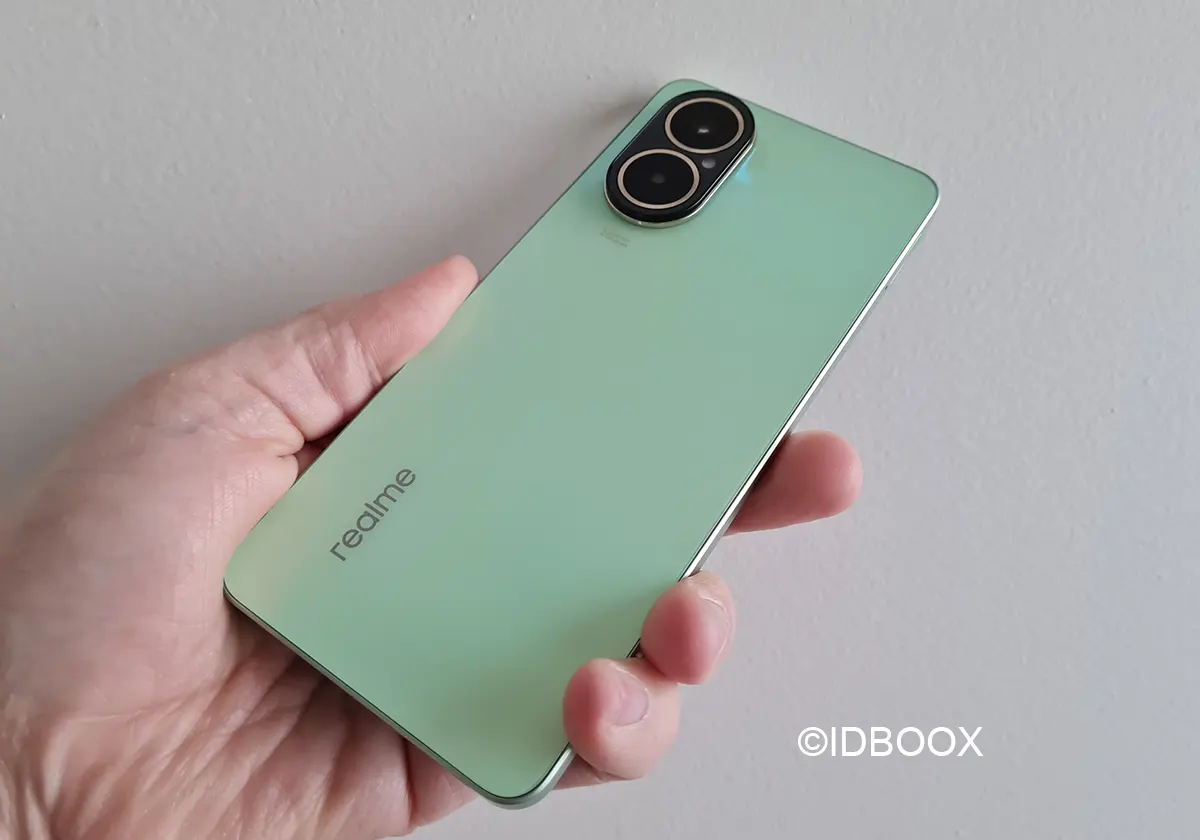 La coque arrière est en plastique mais elle a le mérite d’être vitaminée avec de jolis effets verts dorés. Realme lui a donné un petit effet satiné/brillant qui n’est pas déplaisant. Autre point positif, elle ne marque pas les traces de doigts.