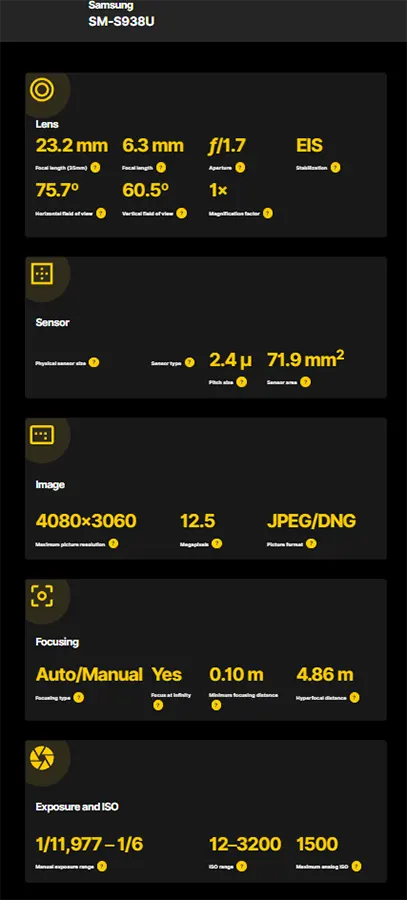 Le listing mentionne la présence d’un capteur principal de 12,5MP. Le capteur a une distance focale équivalente de 23,2mm ce qui correspond une distance focale réelle de 6,3mm. L’ouverture est de f/1.7. En se basant sur ces données, on peut déduire que l’appareil photo du Galaxy S25 Ultra repose sur un capteur de 200MP. Il utilise la technique du Pixel Binning qui combine 16 pixels en 1 pour sortir des photos en 12,5MP.