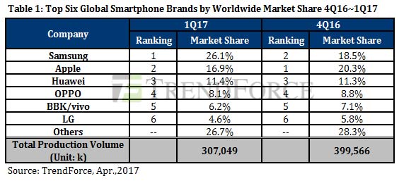 TrendForce a examiné à la loupe les ventes de smartphones des principaux constructeurs au premier trimestre 2017.