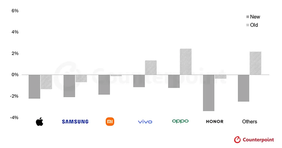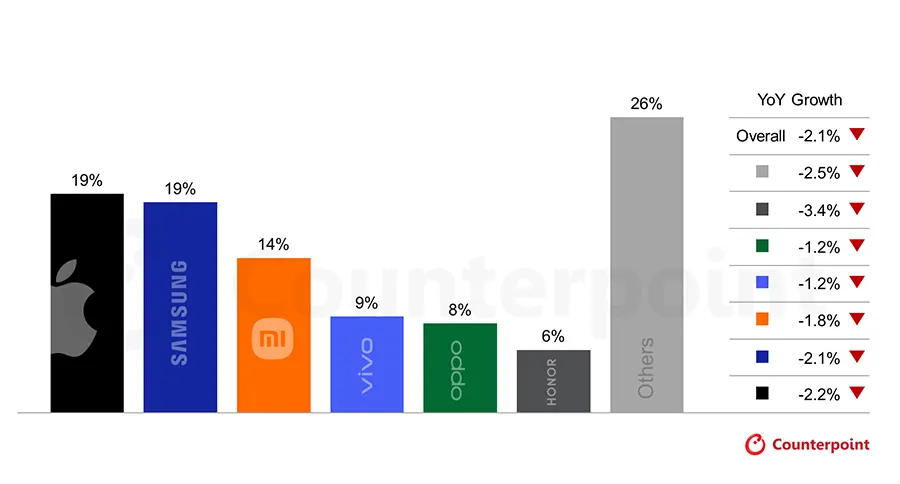 Tous les constructeurs vont être touchés par cette baisse des ventes. Selon les estimations de Counterpoint, les baisses s’échelonnent entre 1,2 % et 3,4 % selon les constructeurs.