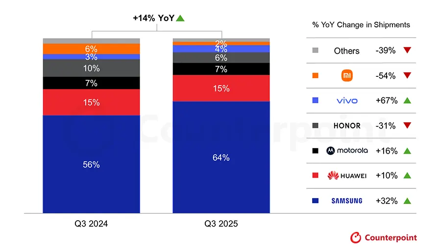 Sur ce segment, Samsung est le grand gagnant au troisième trimestre 2025. La transformation du Galaxy Z Fold 7 et du Galaxy Z Flip 7 ont séduit les consommateurs. Samsung capte 64 % de part de marché contre 56 % l’année dernière à la même période.