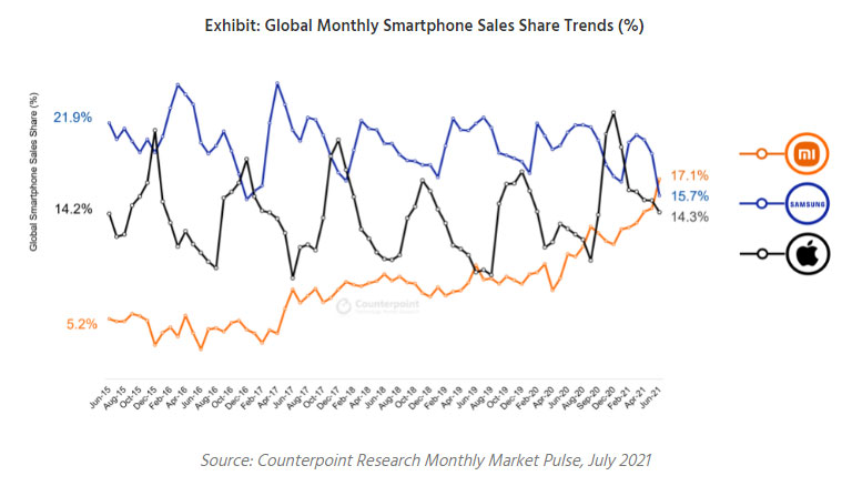Xiaomi est devenu numéro un mondial au mois de juin 2021 d’après les relevé de Counterpoint. C’est une place qui demande à être confirmée dans les mois à venir. Si on regarde ses résultats sur l’ensemble du trimestre, elle reste derrière Samsung.