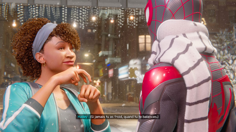 Enfin, je fais une mini parenthèse pour vous parler d’un moment touchant et très inclusif que j’ai pu noter dans ce jeu, la présence d’un personnage sourd-muet qui parle en langue des signes avec Miles (Voir la capture avec Hailey ci-dessous ). Cliquez sur ce lien pour acheter le jeu Spider-Man : Miles Morales