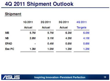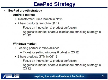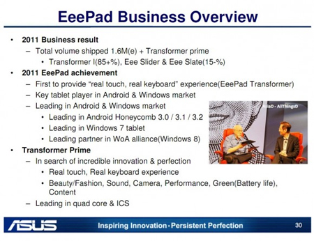 L’Eee Pad Transformer s’est vendue à 1,2 millions d’unités. Elle représente 85% des ventes des tablettes du constructeur. Les 15% restant se partagent entre Eee Slider et lEee Slate. Avec l’Eee Pad Transformer Prime, Asus espère vendre 600 000 tablettes en Q4. La Prime sortira, comme nous l’avions annoncé précédemment, le 9 novembre.
