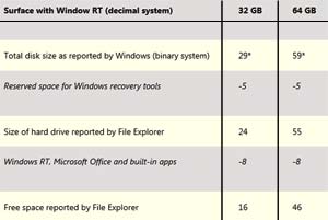 Microsoft a levé le voile sur l’espace de stockage réel disponible sur la tablette après avoir enlevé le système d’exploitation et les diverses appli embarquées. La Surface RT est disponible en deux versions 32GB et 64GB. Dans un cas comme dans l’autre, il faut opérer quelques petites soustractions pour connaître l’espace disponible sur les tablettes. Après avoir enlevé Windows RT, les outils de sauvegarde et les applis du genre Microsoft Office, il reste 16GB de libre sur la version 32GB et 46GB sur la tablette 64GB. Ce n’est pas si mal.