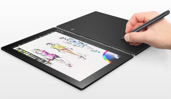 Lenovo a pensé la Yoga Book pour les personnes créatives ou les auteurs. En désactivant l’écran, cette partie se transforme en tablette graphique. La Yoga Book est accompagnée d’un stylet avec 2048 niveaux de pression et un angle de détection de 100°.