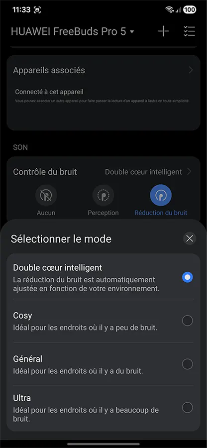 L’interface de l’application propose quatre niveaux d’ANC, dont un qui s’adapte intelligemment à l’environnement. Dans la pratique, les écouteurs émettent un bruit sourd quand la réduction de bruit est activée sans musique.