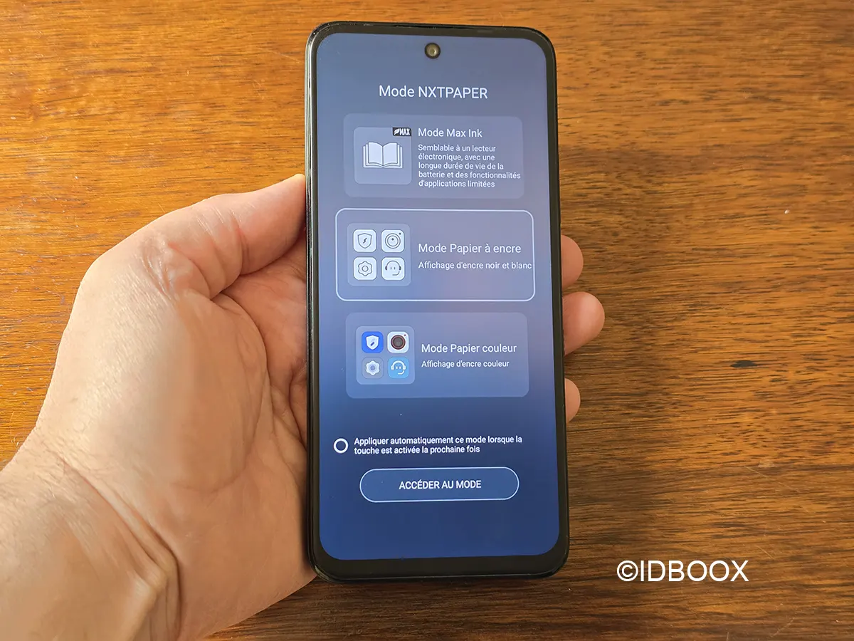 Le smartphone passe en mode NXTPaper grâce à un bouton placé sur le côté. L’interface propose trois affichages adaptés à différents types de lecture.